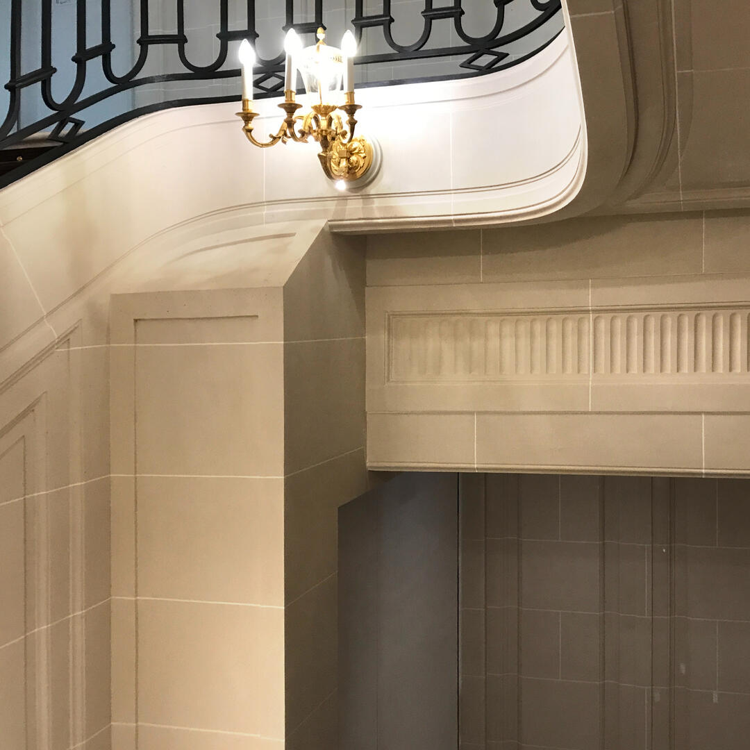 Our achievements include the plaster of the Winter Garden of the Hôtel de Crillon, the entrance and the stone stucco staircase of a private mansion on avenue Foch and more recently the marble stucco columns of the Graff Diamonds Paris flagship, located Place Vendôme.